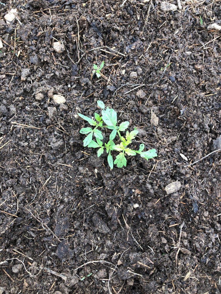 Then before I transplant or start seedlings in ground I pre-treat my my soil with blood meal to add nitrogen again until my plants are bigger and ready to start flowering. In the off season we also dump our horse manure in the garden. This year we also added some turkey manure and mushroom compost we bought. In addition to a small composting corner we use for kitchen scraps. This is a little tomato seedling that came up after we spread the compost!