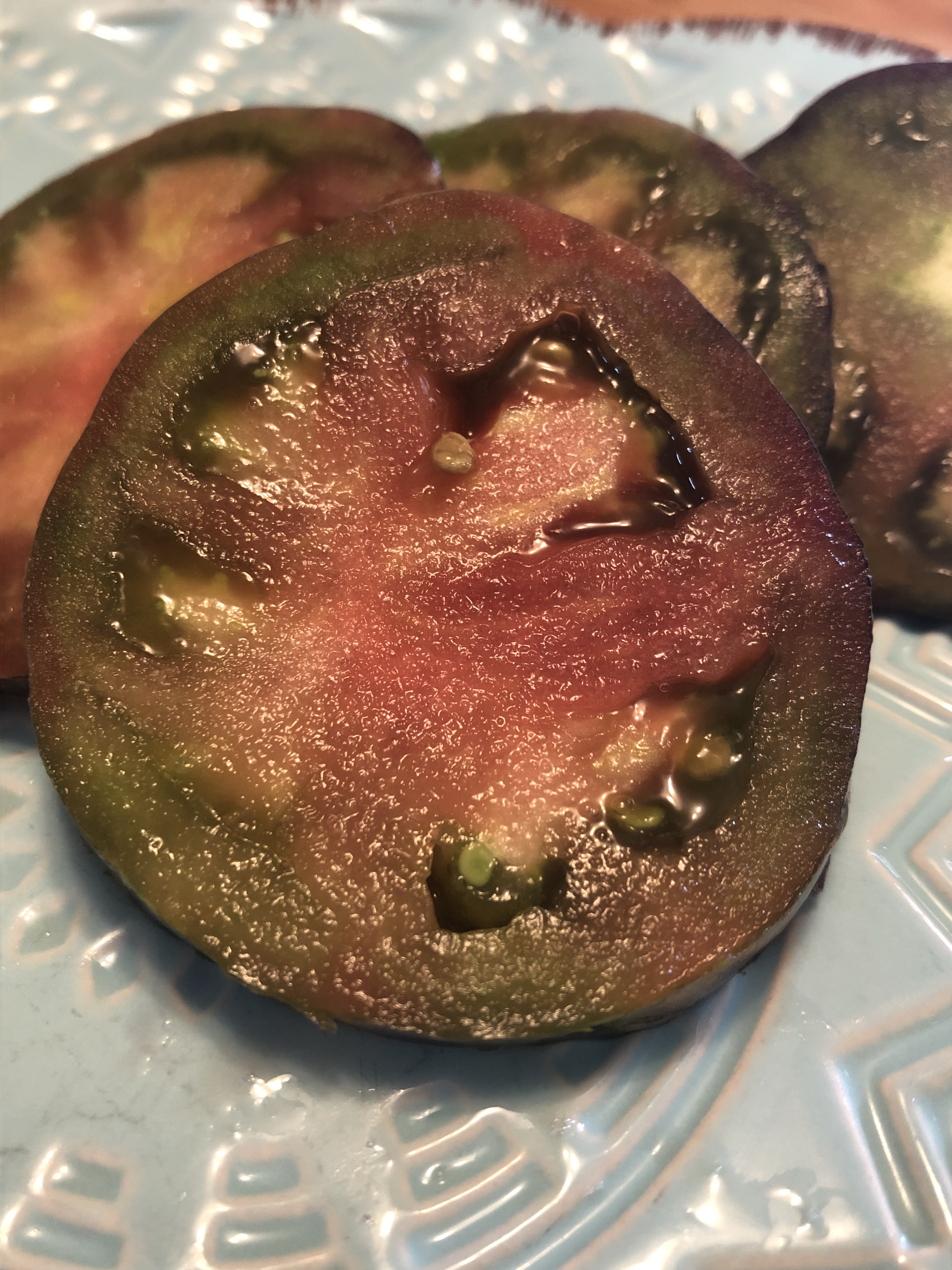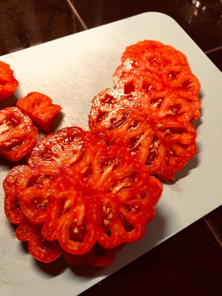 I have been watching this giant tomato for over a week waiting for it to show signs of ripening. Everyday ….. nope still green….. nope still green….. not even a blush of color! Finally the day arrives (I mean I didn’t know it arrived but I was hopeful).